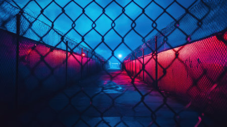 A captivating view of a dark alleyway framed by a chain link fence, illuminated by vibrant neon lights creating a mysterious and atmospheric urban scene.