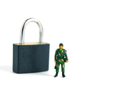 Pandemic coronavirus conceptual miniature people photography – Lockdown illustration – miniature soldier stand guard in front of padlock. Image Photo