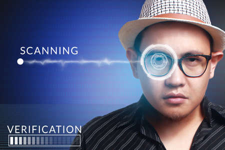 Eye Detection System, Portrait of Asian man's face with eye sensor technology, scanning and verificating facial recognition
