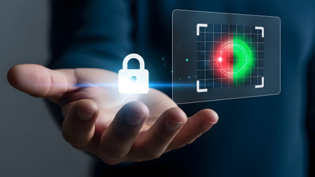 Hand holds glowing padlock icon next to a futuristic interface showing a biometric scan.