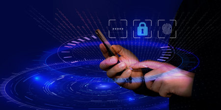 A programmer is browsing the Internet in smart phone to protect a cyber security from hacker attacks and save clients confidential data. Padlock Hologram icons over the typing hands.