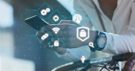 Businessman hands typing in phone, double exposure hud with digital icons. Padlock and shield with digital lines. Concept of authorization and touch id
