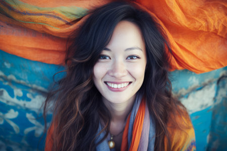 A joyful woman from Afghanistan smiles warmly, displaying a sense of resilience. Her colorful scarf reflects cultural heritage as she sits in her inviting home environment. Generative AI.