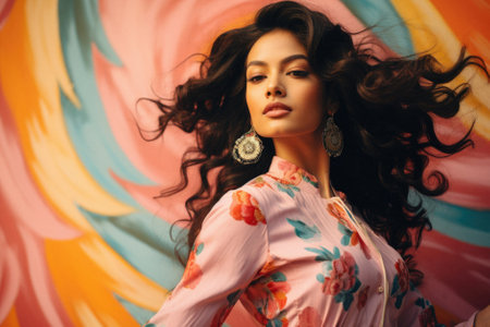 A Tajik woman 30 years old stands gracefully, showcasing her traditional attire against a breathtaking backdrop of defocused lush greenery, reflecting her cultural roots. Generated by AI.