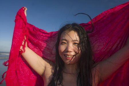outdoors lifestyle portrait of young beautiful and happy Asian Chinese woman in swimsuit at the beach playing carefree with sarong enjoying Summer holiday feeling free and blissful