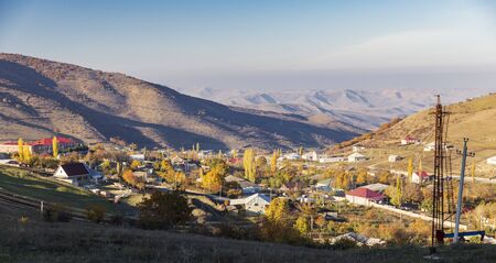 Aerial view of small village in the mountains at sunset. Beautiful landscape
