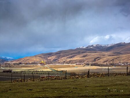 Panoramic view of Litang old town in Ganzi Tibetan autonomous regionin SIchuan China, with scenic mountains in the background