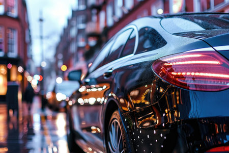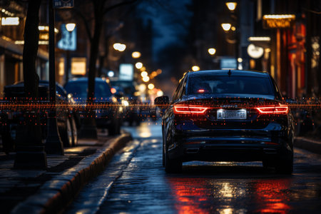 Modern black cars are parked on a wet street at night, illuminated by their headlights and city lights reflecting on the glossy surface