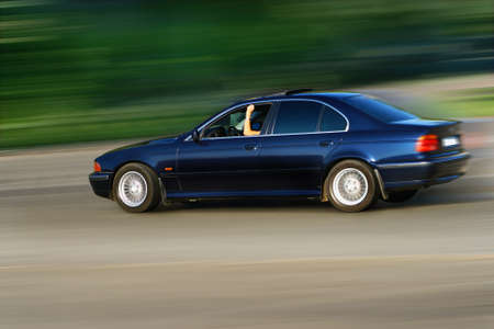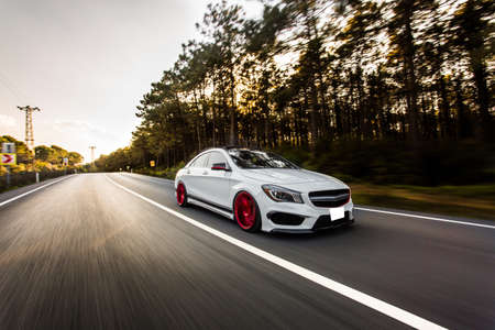 Car driving fast on intercity road at sunset. Highway traffic in evening