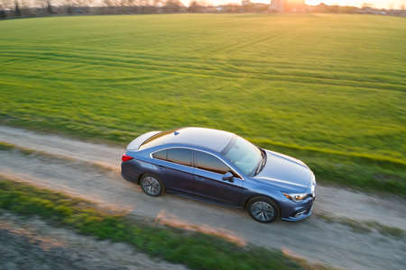 Aerial view of sedan car driving fast on dirt road at sunset. Traveling by vehicle concept