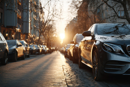 Parked cars in a sunny city street at sunset surrounded by buildings and trees creating a warm urban atmosphere
