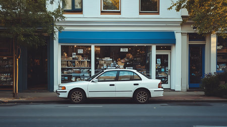 A white taxi pauses outside a charming bookstore capturing the essence of urban life.