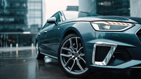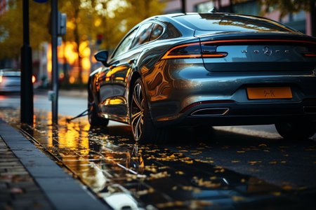 Luxury car with a illuminated taillights parked in a modern underground parking garage with wet reflective floors