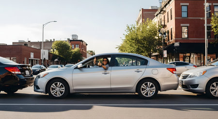 A cheerful woman gives a thumbs-up from the driver's seat of her silver sedan after successfully completing a difficult parallel parking maneuver on a busy city street. The image represents achievement, driving skill, and a small victory in urban life.