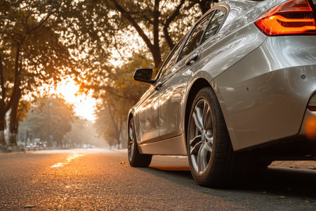 close up car on street automotive roadtrip on sunset background for transport, travel of nature to vehicle auto landscape light the sun for travel journey trip summer and lifestyle