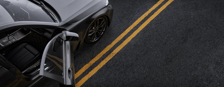 A black car is parked on the side of the road. With the door open. 3d, rendering, illustration,