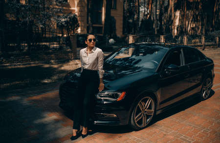 Beautiful young woman in sunglasses stands next black modern car on city street.