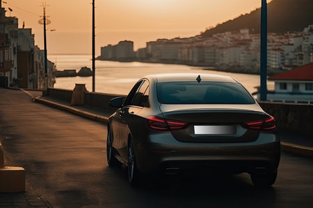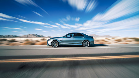 High-speed luxury sedan cruising along the highway during sunset, showcasing sleek design and power