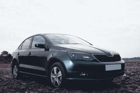Close-up detail front of modern new shiny empty black car parked outside road in high grass on bright summer sunny day on blurred green trees background. Transport, pollution and ecology concept.