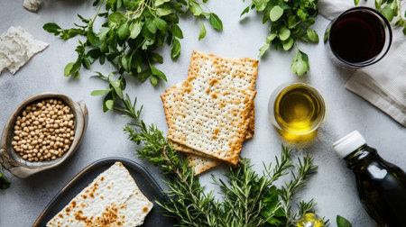 A beautifully arranged Passover table setup featuring matza, wine, sesame, and olive oil, set on a chic grey backdrop with delicate greenery and cream cheese