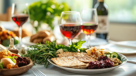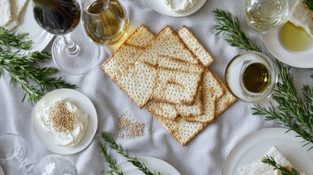 Table served for Passover (Pesach) indoors, with matzah bread as symbolic Pesach (Passover Seder) item.