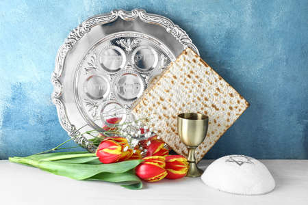 Passover Seder plate with cup of wine, tulip flowers, kippah and matza on table against color background