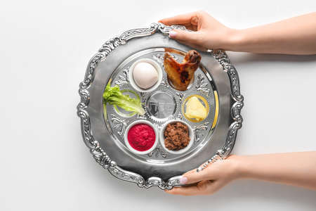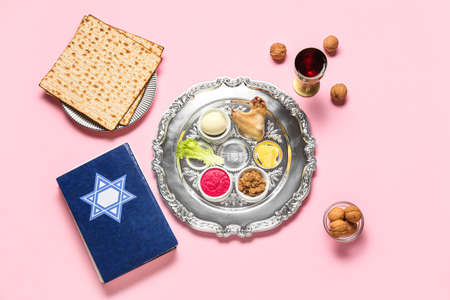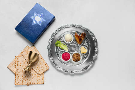 Pesah celebration concept jewish Passover holiday egg and seder plate