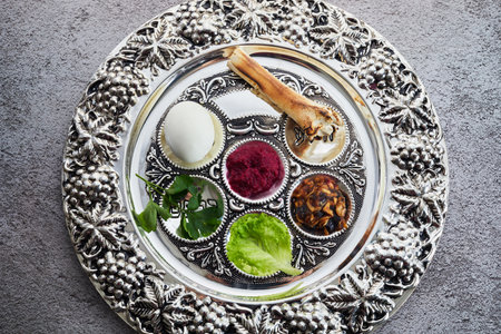 Traditional passover seder plate food arrangement roasted lamb shank parsley hard-boiled egg horseradish bitter herbs charoset for jewish holiday celebration.