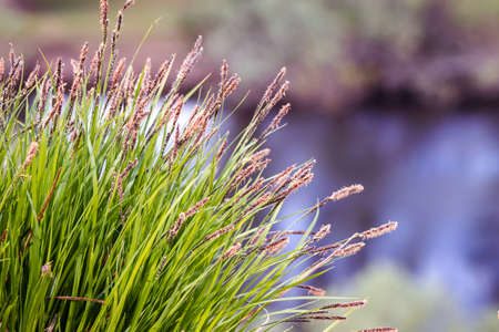 Flowering grass on the background of the river in the summer