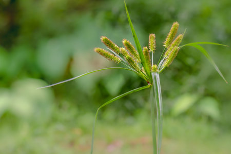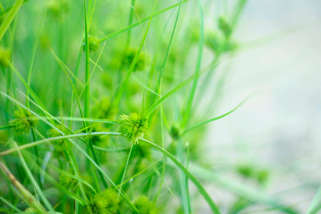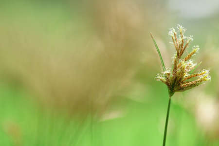 Top view of Green Kyllinga flower blooming with long leaf in lawn, Thailand.