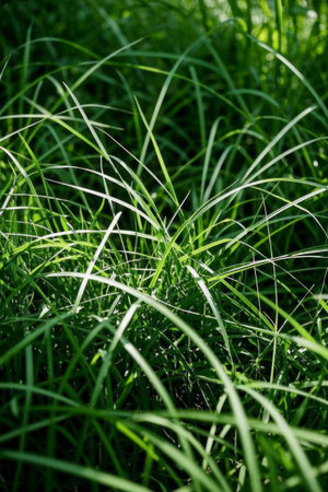 Explore the intricate textures of lush green grass blades in this close-up image, capturing the organic beauty of nature's vibrant greenery. Perfect for nature themes.