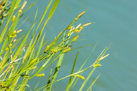 Green grass texture and background with bokeh on Sunny day. Bright juicy sedge grass on green blue yellow blurred background closeup. Plants by the pond, macro. Beautiful summer landscape.