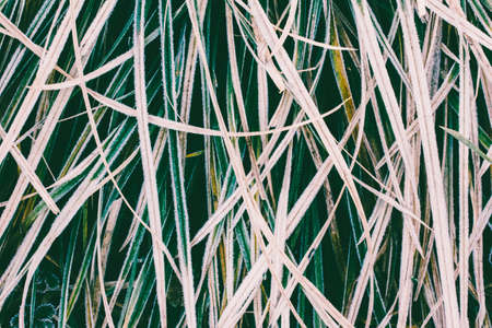 Frozen green grass as a background texture image. The grass is covered with hoarfrost. Top view. Copy, empty space for text.