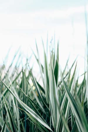 Decorative green and white striped grass. Arrhenatherum elatius bulbosum variegatum. Soft focus. Natural background.