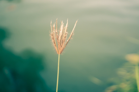 Flower grass on river ,reflected water in evening time with sunlight background