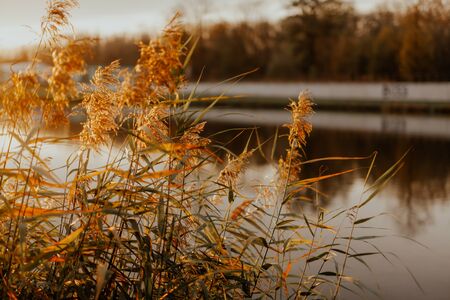 very nice autumn reed with blurry background with sun
