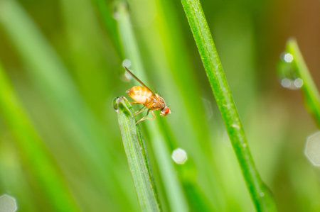 fly sit on grass with dewdrops