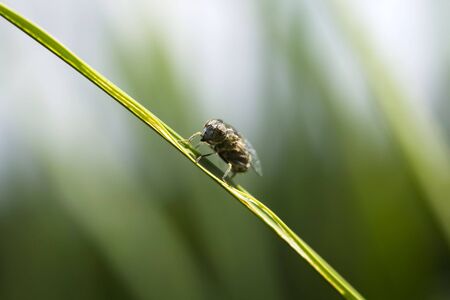 Fly on a blade of grass in the meadow. Shallow depth of field