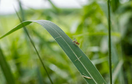 A small wasp sitting on a wild leaf close up background
