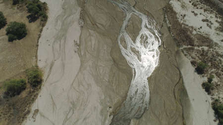 Dried up river bed among the farm fields in the mountainous province Philippines, Luzon.Drought. Aerial view: relief of mountain valley with river.