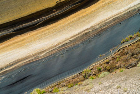 Slice of a hill on Teide volcano. Colorful volcanic soil. Desert ground.
