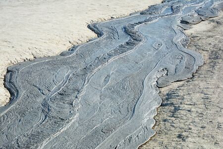 Mud flow from a mud volcano. Cracked mud surface. Mudflow texture with cracks.