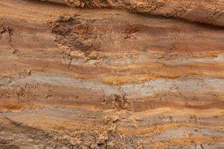 textures of various clay layers underground in clay quarry after geological study of the soil. colored layers of clay and stone in section of the earth, different rock formations and soil layers.