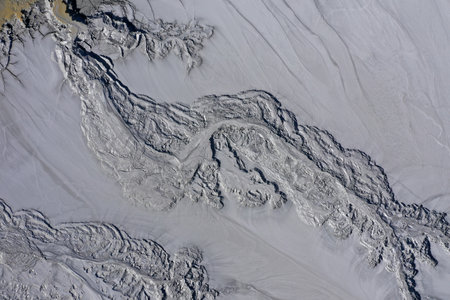 Aerial view of gray abstract mud patterns and cracks on acid mine drainage surface by drone
