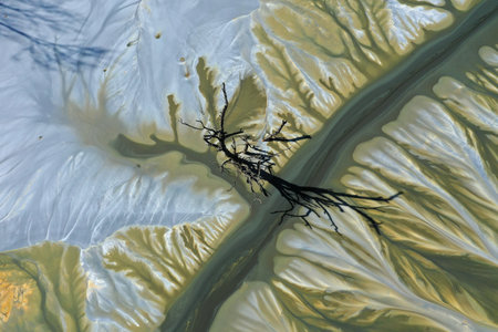 Top down aerial view over natural texture - abstract industrial lake water patterns. Turquoise waternature poluttion