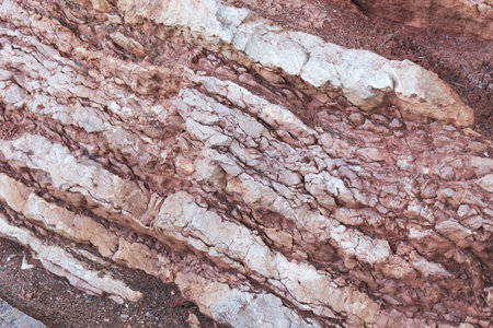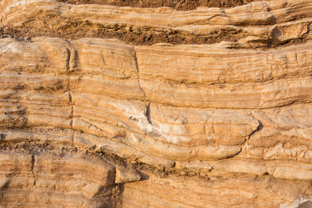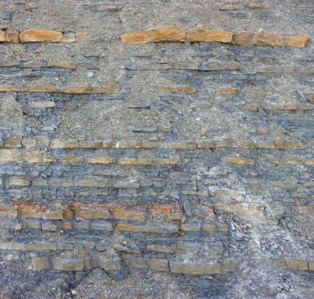 Closeup of layered stone and detail. Remote and textured background layers of earth, sedimentary minerals, stones with copyspace. Mining underground geological strata rock or sand for geology studies
