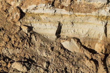Colored layers of clay and stone in the soil section, various rock formations and layers of soil