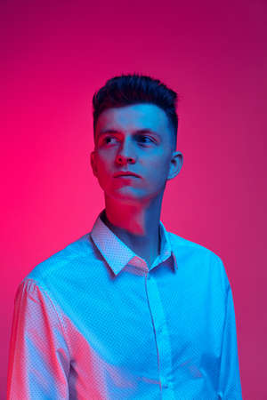Half-length portrait of young handsome man in white shirt posing isolated over magenta color studio background in blue neon light