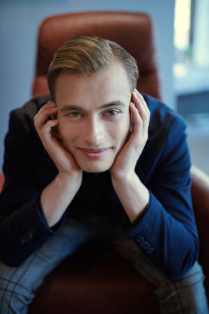 Portrait of a happy young businessman sitting on a leather armchair in his office and smiling. Business and success. Happy people concept.