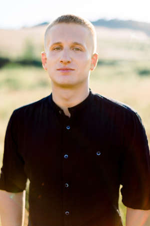 Portrait of handsome blond young Caucasian man in black shirt and pants, posing outdoor in beautiful summer field at sunset.